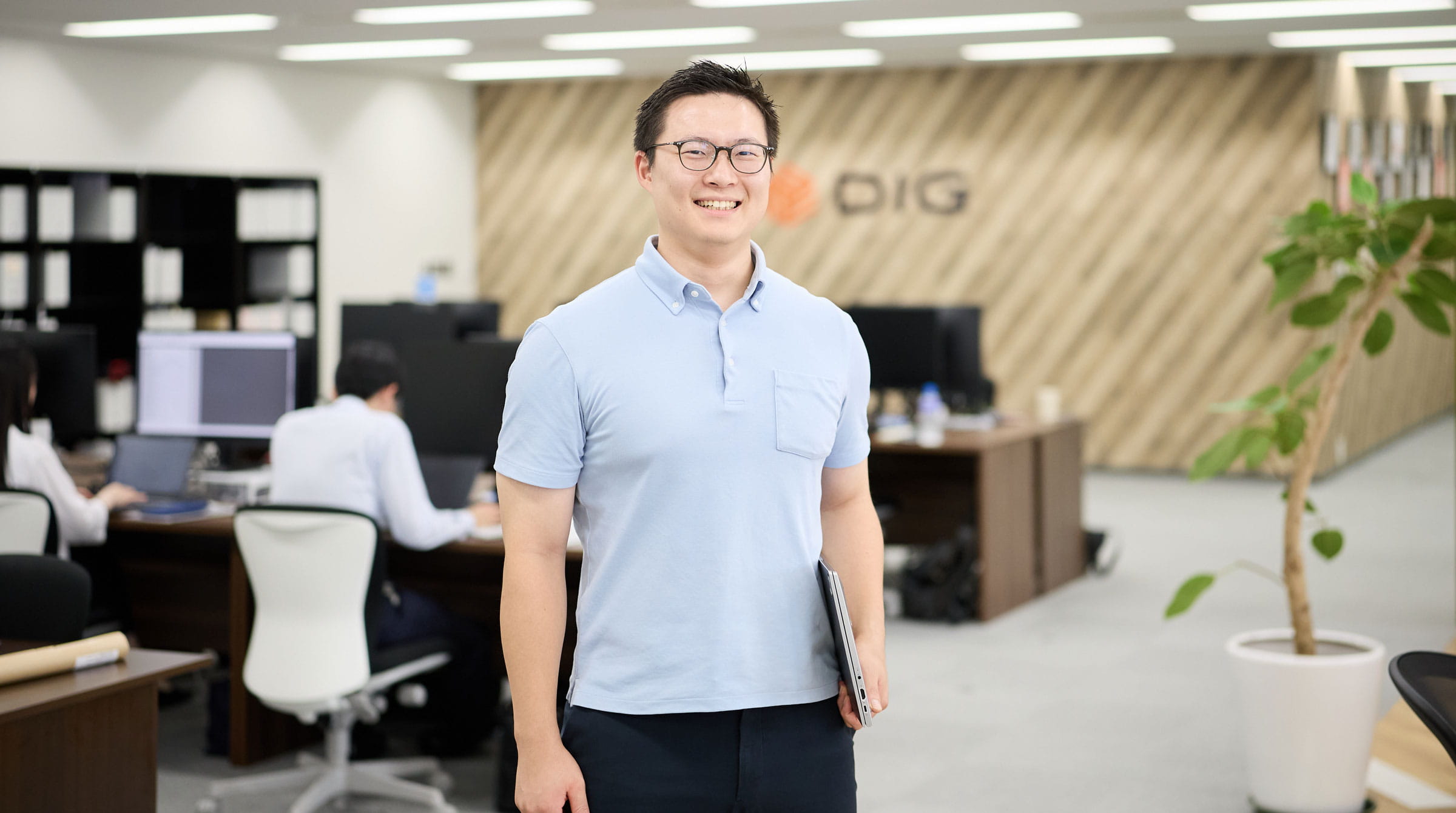2015年3月に同志社大学法学部を卒業後、福岡の地方銀行で法人営業担当として8年間勤務した後、DIGに入社。2024年12月に課長に昇進。