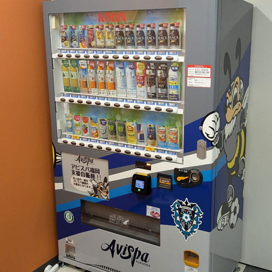 福岡天神本社と天神事務センターのオフィス内にアビスパ支援自販機を設置。通常よりも低価格で購入することができ、売上の一部がアビスパ福岡の支援金になります。さらに、フリードリンクとしてミネラルウォーターも用意しています。
