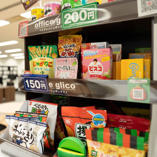 福岡天神本社と天神事務センターのオフィス内にオフィスグリコを設置。お菓子・アイス・飲み物を手軽に購入できます(PayPay払い対応)。設置のない拠点では、お菓子購入補助制度を導入しています。