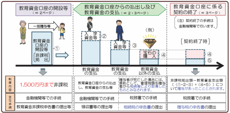 こちらも専用口座を通じて資金を管理し、実際に支払った教育費について、領収書等を提出することで非課税の適用を受けます。
