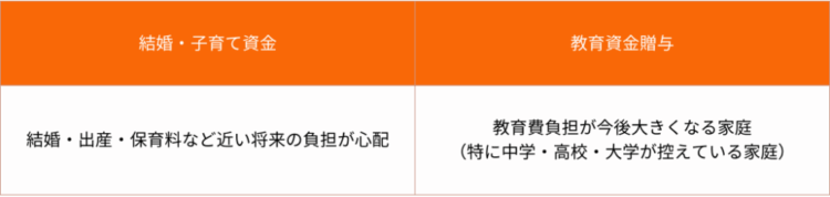 一方で、結婚・子育て資金の非課税制度は、結婚、妊娠・出産、保育といったライフイベントに伴う費用を対象とする制度です。ただし、小学校以降の学費などは対象外となります。