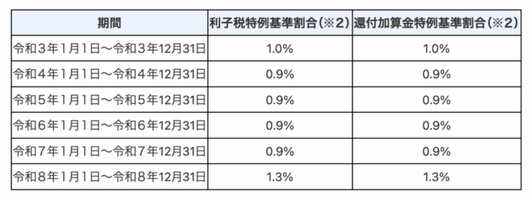 引用元:国税庁「利子税(所得税法第131条、136条、法人税法第75条、75条の2、相続税法第51条の2、52条、53条及び消費税法第45条の2に係る利子税)及び還付加算金の割合」